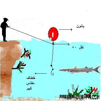 تنفخ البالون جيدأ وتربط به الثقل عند نهاية القفلة وبعدها ينزل من البلون الخيط الذي بدوره تكون انت معاك الطرف والطرف الاخر يكون فيه السنارة او الخطاف مربوط بلطعم اليك الرسم التوضيحي طبعا هذه الطريقة تكون وانتا واقف على الكسارة وليس من السيف او الشاطئ طبعا بعد رميك للبالون مع السنارة بلماء الموج كيف ما كان حياخذ البالون من نفسه لداخل البحر ويفضل وانتا اي مسافة وصل بها البلون تقدر بسحبك للخيط ان توقفه ولا تخاف ما حيضرب عليك البالون