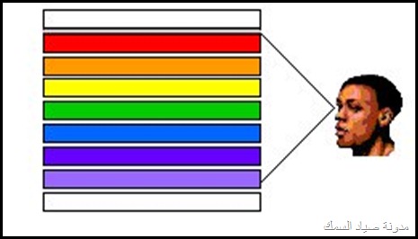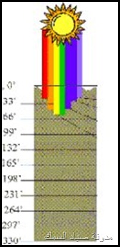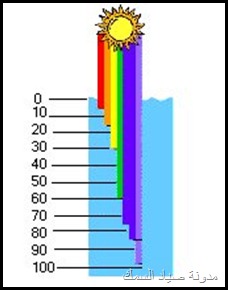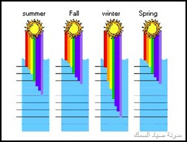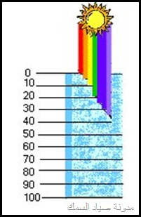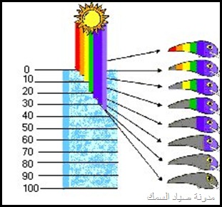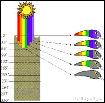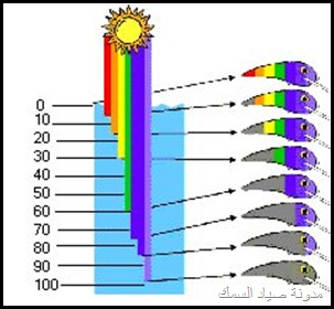 الضوء الأبيض تتكون من أضواء مختلفة الألوان (موجات) ألوان الطيف أحمر أخضر أصفر و و و و و تظهر عبر قطعة الزجاج إللي درسناها أيام الإبتدائية عندما تتجمع هذه الألوان فتتضح الرؤية للإنسان تسقط أشعة الشمس على جسم ما مثلاً الشجرة و تتجمع جميع الموجات والألوان عليها تظهر لنا اللون الأخضر وهكذا في كل شيئ نراه . و عندما تسقط أشعة الشمس على سطح الماء يختلف تدرج وصول الأشعة بعد إنقسامها على حسب الماء في المياه الصافية والمياه الشبه صافيه المياه الغيرصافية والتي مخلوطة بالطحالب والفقاعات الصغيرة والكائنات الغير مرئية بشكل كبير فتصعب وصول الموجات الضوئية للأعماق المعروفه مثال عندما تنتهي الأشعة الحمراء على عمق 10 أمتار ستجد أن اللون الأحمر أسود وهكذا للبرتقالي والأصفر والأخضر والأزرق والبنفسحي وهكذا وقد تتلون الألوان الظاهرة خارج الماء بألوان ليست لها مثال تظهر على ظهر السمكة مثل الناجل والهامور خطوط بيضاء وهي في الأصل عدم وصول الموجة المطلوبة للإضاءة اللون المطلوب أو تأثير الأشعة البنفسجية على اللون الفلاني ويعطيك المرادف له هذا و تختلف إنقسامات الضوء على سطح الماء مثلا في الفصول الأربعة تختلف كما في الرسمة التالية بالنسبة للخداعة أو الطعم البلاستيكي أو الـــ Lure وأهم مافي الموضوع اليوم هو الطعم في هذه الأعماق طبعا لكل طعم عمق معين فلما تحصل طعم رخيص أفتكر مقالتي ولازم تعرف إمكن يلمع على عمق مترين وبس . للمياه الصافية يكون درجة الألوان على الطعم تختلف في تدرجاتها حسب العمق ونوع الموية وهذا للشبه صافيه وهذا للعكرة ولذلك يجب أن تسأل البائع على الأقل عشان يعرف إنك فاهم , أصلا لما تشرحله الألوان بطريقة الموضوع هذا تلاقيه يبتسم ولا يضحك لأنك يمكن تدلدل الطعم لوقت طويل ولا تجد شيئ لأنها تعتبر سوداء في العمق ولايراها السمك رغم إنك في عز الظهر ولكن كيف تراها الأسماك في الليل أعتقد للقمر دور في ذلك أو جودة الطعم المُصَنع من فئة الممتاز لذالك لاتاخذ المضروب منقـــــــــــــول... |