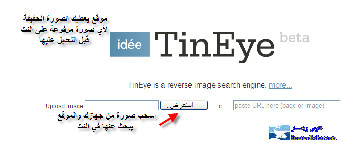 ولكن هذا الموقع خرج عن المالوف جدآ أختصاص هذا الموقع أنه يعطيك الصورة الحقيقة التي تبحث عنها من خلال محرك البحث التابع للموقع مثلآ اذا بحثت عن صورة فوتوشوب ملعوب فيها بالفوتوشوب أو اي برنامج تصميم أخر . فأن الموقع يحضر لك الصورة الأصلية للصورة التي تبحث عنها وهــذا البرنامج يفيد مصممي الفوتوشوب بحيث يبحثون عن الصور الأصلية لأي صورة معدلة بالفوتوشوب من قبل مصممين أخرين والعمل عليها بكل سهولة بحيث يوفرون الوقت الذي يقضونة في أزالة عمل المصمم السابق اضغط هنآآآآآ |