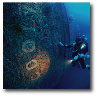 و لمحبي الغوص عموما ,أود أن أذكر لكم أن غوص الحطام يعتبر من أمتع أنواع الغوص لما يحمل في طياته من تاريخ و قصص وعبر , وتزداد متعة الغوص اذا قرأت عن تاريخ الحطام قبل الغوص فيه حتى يتسنى لك محاكاة التجربة و استعادة التاريخ لحظة بلحظة معايشا لحظات الغرق وشعور من هلك من الركاب و ذكريات من نجا منهم وكيف كانت لحظات المأساة وكيف أن كل شئ هالك وفان الا وجه الله . وأود أن انبه بشدة على أهمية اجراءات السلامة المعروفة و المتبعة في غوص الحطام و أترك المجال هنا لإخواني مدربي الغوص للتحدث عنه لاحقا . سأبدا التصنيف من المركز العاشر الى المركز الأول تباعا مع ارفاق الصور. و نبدأ بالمركز العاشر : 10- حطام سفينة الركاب RMS Rhone تعتبر هذه السفينة من أجمل حطام السفن الموجودة حاليا و ترجع قصتها الى 140 سنة مضت حيث صنعت في بريطانيا في منتصف القرن التاسع عشر لكي تكون سفينة ركاب عابرة للمحيطات غير قابلة للغرق (قبل التيتانيك ب 45 عاما) و قد ظن صانعو تلك السفينة أنها لا تقهر و لكن سبحان من له الدوام, فبعد سنة من تشغيلها غرقت في عاصفة رعدية وقام الأعصار بقلبها رأسا على عقب وأسكنها قاع البحر خلال دقائق معدودة. و يستطيع الزائر لجزر العزراء البريطانية بالبحر الكاريبي الغوص في هذا الحطام ويذكر المؤلف أنه شعر شخصيا بأشباح الغرقى و هي تبعه أتناء غوصه في غرف و ممرات الحطام والعهدة عليه !!!! وقد أصبح الحطام مركزا مهما لنمو العديد من الأحياء المائية و الأنواع النادرة من الأسفنج و المرجان بالإضافة الى القشريات العملاقة و الأستاكوزا وبعض أسماك الجاك و الجروبر (الهامور) الضخمة. ويتراوح العمق بين 22 الى 40 متر. 9- الغواصة الألمانية U-352 يأتي حطام الغواصة الألمانية في المركز التاسع من التصنيف حيث غرقت قبالة سواحل جزر البهاما أثناء الحرب العالمية الثانية أي مند 65 عاما وقد هلك طاقمها المكون من اربعين بحارا عن بكرة أبيهم في واحدة من أسوأ الحوادث الحربية وأشهر معارك الغواصات في التاريخ ويستطيع الغواص أن يرى فيها اليوم الطوربيدات والصواريخ وهي حميعا بحالة جيدة. والجدير بالذكر أن تلك الغواصة كانت تعتبر شبحا مخيفا للقوات الأمريكية في الكاريبي والموضوع قد عولج دراميا في فيلم سينمائي شهير من بطولة دينزل واشنطن. 8- حطام Jake seaplane ويأتي في المركز الثامن وأود أن اشير أن الحطام ليس لسفينة وانما لطائرة يابانية أسقطت ابان الحرب العالمية قبالة سواحل جزر بالو في المحيط الباسفيكي.حيث كانت تلك الطائرة في طريقها للهجوم على القوات الأمريكية (لمزيد من المعلومات يرجى مشاهدة فيلم بيرل هاربور) وقد أصيبت الطائرة في ذيلها فقط مما أتاح للغواصين اليوم فرصة استكشاف الهيكل بالكامل. وترقد الطائرة على عمق 28 متر بكامل حمولتها من القدائف ويكن رؤية كابينة القيادة التي تتسع لثلاثة أشخاص و معاينة المحرك الأمامي في مقدمة الطائرة والأجنحة بكامل طولها . 7- حطام السفينة SS President Coolidge يأتي في المرتبة السابعة وكانت هذه السفينة في الأصل سفينة ركاب فارهة الى أن قامت القوات الأمريكية بشحنها بالجنود لدعم مشاة البحرية في منطقة الباسفيك أثناء الحرب العالمية أيضا, وأثناء أحد الرحلات صحا الجنود على صوت انفجار مدوي أكتشف فيما بعد أنه ناتج عن انفجار أحد الألغام البحرية وسرعان ما حاول ربان السفينة السيطرة عليها بقيادتها نحو الشاطئ ولكن لغما اخر انهى القصة سريعا بعد أن كان القبطان قد أقترب فعلا من الشاطئ قدر الإمكان و الغريب في الأمر أن أحدا لم يصب بمكروه في تلك الحادثة !! والحطام يقع اليوم في جزر الكاريبي والجزء العلوي منه يمكن الوصول اليه بالغوص العادي أما الجزء السفلي فيلزمه الدراية بقواعد الغوص التقني لعمقه الشديد ووجوب استخدام جداول معقدة لخليط الغازات المستخدم لتنفس الغواص وخطة وقفات الأمان أثناء الصعود . 6- حطام السفينة YO 257 ويأتي في المركز السادس من التصنيف اليوم وهو حطام سفينة عسكرية أمريكية كانت تستخدم لتزويدالقطع الحربية البحرية الاخرى بالوقود وقد غرقت قبالة