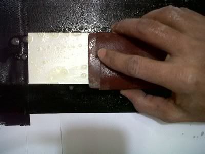 9- اتركه لمدة 5 ساعات في اشعة الشمس ومن ثم خذ وعاء وضع فيه قليل من الصابون وقطعة قماش بللها في الماء واغسل الجليكود الجديد طبعا هناك ارتفاع وغير مستوي مع سطح القارب . لذلك امسك في يدك اليمين قطعة خشبه مستطيله بطول 10 سنتيمتر ولف الصنفره بمقاس خشونه 220 وبيدك الاخرى قطعة القماش لتبليل المنطقه باستمرار طالما ان تقوم بالصنفره ولا تضغط بقوم صنفر حتى تغيب الحروف البارزه