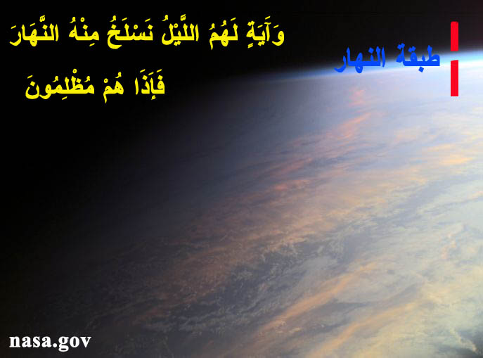 تأمل عزيزي القارئ هذه الصورة الحقيقية لسطح الأرض والملتقطة من إحدى مراكب الفضاء (من قبل وكالة الفضاء الأمريكية)، كيف تُظهر أن النهار ما هو إلا طبقة رقيقة تغلف سطح الأرض، وهي تماماً كالجلد الذي يغلف جسم الدابة، ومع دوران الأرض نرى هذه الطبقة وكأنها تُسلخ من على ظهر الأرض سلخاً، هذا هو حقيقة ما نراه في الصورة، ولكن القرآن حدثنا عن هذه الصورة بقوله: (وَآَيَةٌ لَهُمُ اللَّيْلُ نَسْلَخُ مِنْهُ النَّهَارَ فَإِذَا هُمْ مُظْلِمُونَ) [يس: 37]، ألا تشهد هذه الحقيقة على إعجاز كتاب الله في هذا العصر؟!