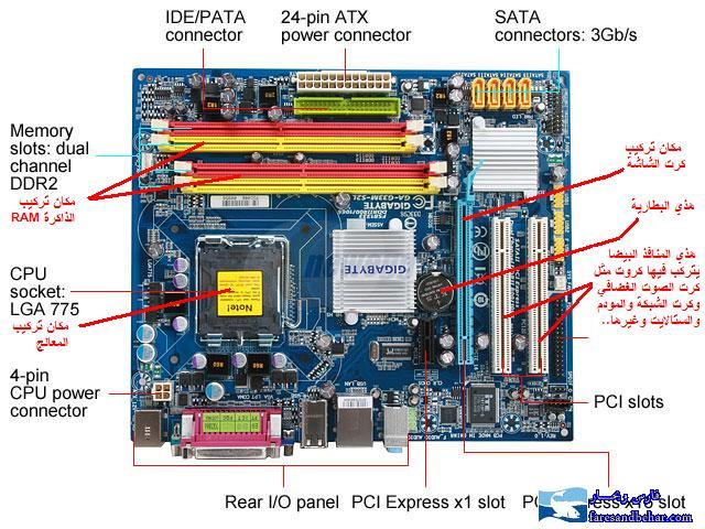 مثل المعالج والذواكر (رام) وكروت الشاشة والصوت والمودم وكذلك توصيل الهارديسك والديفيدي من خلالها ...الخ