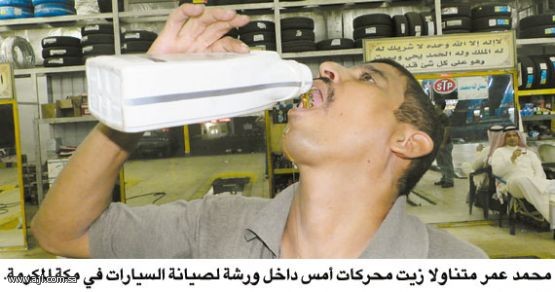 ![]() عاجل - ( متابعات ) أذهل العامل محمد عمر الملقب بـ «ابن عمر» ــ (يمني الجنسية مقيم ويعمل في إحدى ورش تغيير العجلات والزيوت في مكة المكرمة)ـ مشاهديه وهو يتلذذ بتناول زيوت المحركات معتبرا إياها بمثابة العصائر الطبيعية. ابن عمر يعمل في مهنته هذه منذ أن كان في السابعة عشرة من عمره، وقال لـ «عكـاظ الشباب» إن تغيرا مفاجئا طرأ عليه عندما بدأ يتناول مابين 2 ــ 4 علب زيت من جميع أنواع الزيوت الخاصة بمحركات السيارات، وأضاف «أتلذذ أيضا بتناول مياه الراديتر ومياه البطارية وزيت الفرامل، وآكل الشحوم المستخدمة في دهن ديناميكيات السيارات بأنواعها، ويبلغ ما أتناوله من الشحوم يوميا نحو 2.5 كيلو جرام، وأنا مستمر على هذه الحال منذ مدة»، وأوضح «حياتي تسير بكل يسر وسهولة وأخصص مبلغا قدره 900 ريال شهريا لشراء وجباتي من الزيوت والشحوم ومشتقاتها، وصحتي في أفضل حال بحمد الله». ويعتبر ابن عمر يومه الذي لا يتناول فيه هذه الوجبات يوما مملا وناقصا، فيما لا يزال يلفت أنظار مرتادي المحل الذي يعمل فيه لاستبدال إطار أو تغيير زيوت لسياراتهم. الله يخارجنااااااااا خسران صاحب المحل كل الزيوت في بطنه تحياتي ,,,