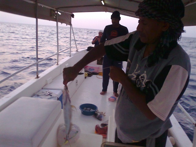 طرحنا وبدأنا بانزال الخيوط وبدأ الخير بيد فهد الصويغ اول الصيد .