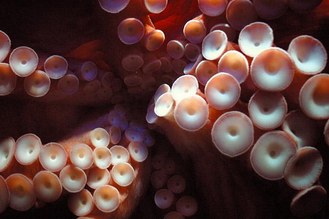(الحيوانات التي ليس لها عظم ظهر). تتنفس هذه الحيوانات عن طريق الخياشيم، مثل الأسماك. ويسبح الأخطبوط بسحب الماء داخل جسمه، ثم يعصر الماء إلى الخارج خلال فتحة في شكل أنبوب أسفل الرأس . تحرك قوة الماء المبعد الحيوان إلى الخلف. ويستطيع الأخطبوط أيضًا أن يفرز سائلا أسود من الأنبوب المذكور. هذا السائل يشكل سحابة مظلمة تخفي الحيوان ليتمكن من الهرب من الضواري كالقرش. جسم الأخطبوط يحتوي على أكياس صغيرة من الأصباغ، . وتتصل أكياس الصبغة مع الجهاز العصبي للحيوان، وتقوم فيها بوظيفتها عندما يضطرب الأخطبوط. عندما يتعرض الأخطبوط لخطر ويستثار من أحد فسرعان مايغير لونه فيجعله أزرق أو بنيًا أو رماديًا أو أحمر أو أبيض بل مجردًا من اللون حتى يستطيع الانسجام مع ما حوله، وتضع أنثى الأخطبوط عنقودًا يحوي نحو 100،000 بيضة. ويلتصق البيض بالصخور ويفقس في شهرين تقريبًا. وترعى الأنثى البيض ولاتأكل خلال هذه الفترة. وتبدأ الصغار في الحصول على طعامها بنفسها بعد الفقس مباشرة. |