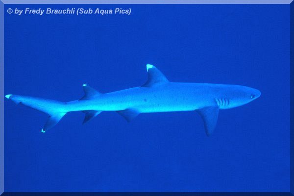 قرش الشعاب ذو البقعة البيضاء : هو من أسماك القرش التى تسكن الشعب ، ويُمكن مُشاهدته فى أغلب الأحيان يرقد فى أحد الكهوف أثناء النهار ، ويعتقد أن أسماك القرش خطرة ، لكن مُعظم الأنواع على الأرجح تتفادى البشر بدلاً من أن تهاجمهم . يبلغ طول هذه السمكة 170 سم ، ويُمكن التعرّف عليها بسهولة من خلال الطرف الأبيض للزعنفة الخلفية ، وطعامها هو أسماك الشعب .
