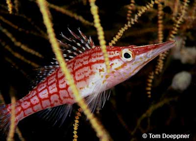 أكثر أنواع الـــ hawkfishes ، وتستقر على قاع البحر وأحيانــًا تثبت نفسها فى مكانها بمساعدة الزعانف الصدرية السفلية الغليظة ، وتندفع كالسهم لالتقاط فريستها التى غالبًا ما تكون من الأسماك وأحيانــًا الجمبرى . وبجانب اللون الساطع الموضح هنا ، هناك أيضًا اللون البنى الداكن الذى يتدرّج إلى اللون البرتقالى المائل إلى الاصفرار نحو المؤخرة .
