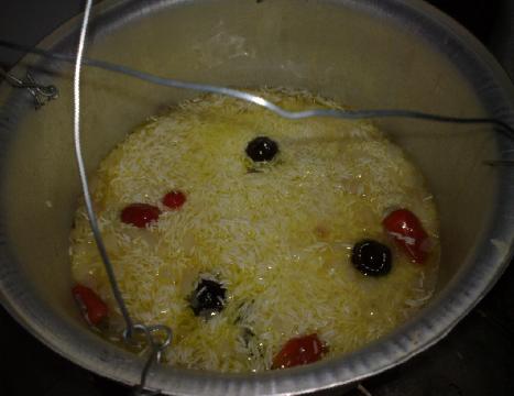 الرز بالبصل وزيت الزيتون والملح يوضع على النار لين يطفح ولا احد يقول وش هالاسيام هذا قدر المندي للتعليق
