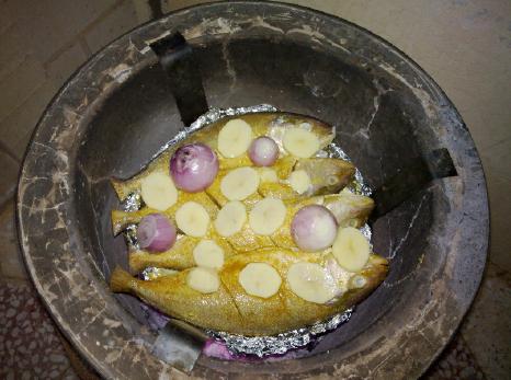 ثم نضع السمك بأعلى البرميل بالشناكير
