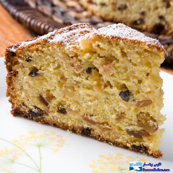 الطريقة : ينقع الزبيب في الماء البارد لمدة ساعة ثم يصفى تخلط قشر البرتقال مع الفوكه المجففة والزبيب ثم تخفق الزبدة مع الفانيلا والسكر في الخلاط لمدة 5 الى 6 دقائق يضاف اليه البيض بيضة واحدة كل مرة ثم نضيف بقية المقادير بدون خلطهم بالخلاط