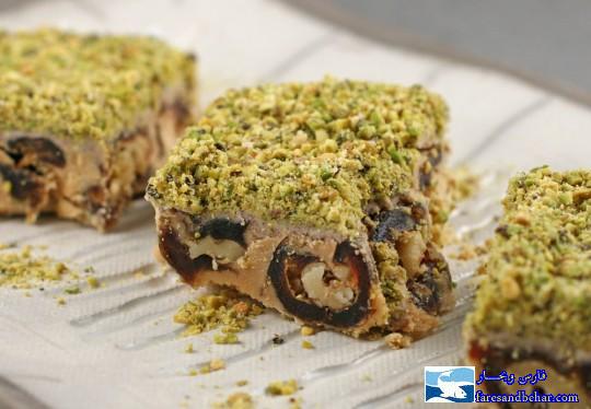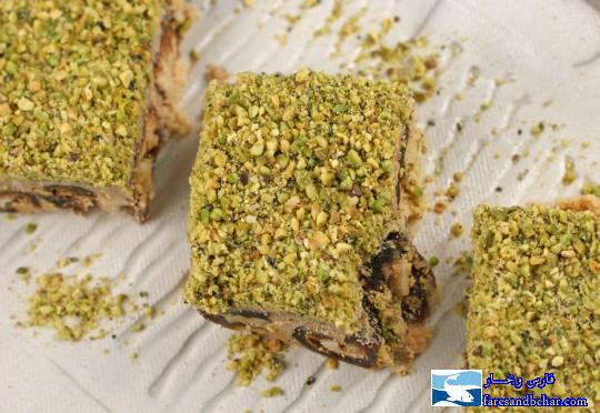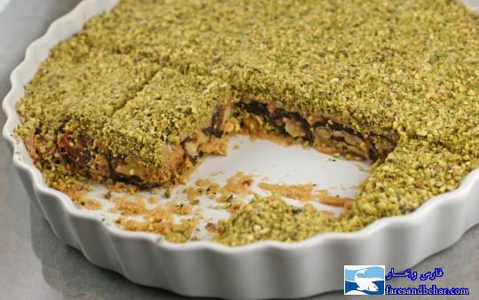 وفي الاخير نضيف الفستق المقطع ونستخدم يدينا لنجعله يلصق بالعجينة
