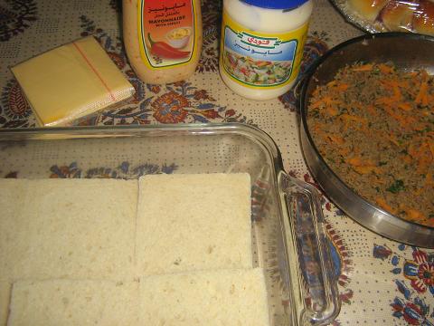 صينية التوست (البريد) باللحم المقادير والطريقه : بريد يكون بدون حوافه البنيه ..توست لحم مفروم .. مايونيز.. جبن بوك الكاسات قشطه قيمر امسح على البريد مايونيز .. واحط فوقه اللحم وبعدها اغطيها بالبريد ..( اخلط الجبن مع قشطه القيمر ) وامسح على البريد واحطها في الفرن مده نص ساعه تقريبا وبالهنا والشفا ,,, |