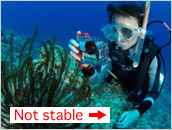 نرى الكثير من الغواصين يقومون بامساك الكاميرا بيد واحدة، فمع امساك الكاميرا بهذه الطريقة لا يمكنك ابدا الحصول على صور واضحة وثابتة لانه في هذه الحالة تقوم بالضغط على الكاميرا بأربعة اصابيع فقط ومحاولة السيطرة عليها لحمايتها من الوقوع او الانفلات وبالتالي سوف ينتقل هذا الجهد العصبي من خلال الأصابع إلى معصم يدك ويسبب في ارتعاش وذبذبات لا شعورية ليدك كاملة وبالتالي للكاميرا.