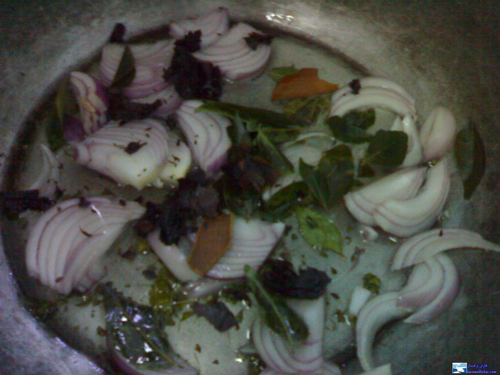 2- نقطع البصل على شكل شرائح ونضع معه اليمون اليابس و الورق الهندي والقرفة ونحركه حتى يلين البصل.