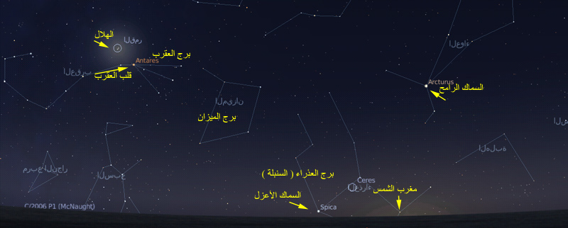 والصورة أدناه توضح موقع السماكين برج السنبلة وجنوبها برج العقرب وبقربه هلال 5-شوال-1430 هـ الموافق24-9-2009 م