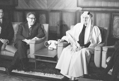 هذه الصورة يجب أن تُدرّس يجب أن تستخرج منها كل المعاني والجمل . . والحكايات عن العزة عن الكبرياء عن الهيبة / : لُطفا تأملوا الصورة في هدوء . . وسوف تشعرون بشيء غريب الذي في الصورة بجوار الملك فيصل هو : " كسنجر" كان الملك فيصل يكرهه إلى درجة كبيرة ولا يتحرج رحمة الله . . من إبداء مقته كما هو واضح . . الصورة كانت بعد إيقاف البترول عن أمريكا وتلاحظون الذل والمهانة على وجه " كسنجر " . .وحينما سأل كسنجر الملك فيصل - رحمة الله عليه - عن مطالبه قال : زوال اسرائيل ويقول ” كسينجر” -وزير الخارجية الأمريكي الأسبق- في مذكراته : أنه عندما إلتقى الملك فيصل في جدّة عــــام 1973 م في محاولة لإثنائه عن وقف ضخّ البترول ! رآه متجهما ً, فأراد أن يستفتح الحديث معه بمداعبة فقال : " إن طائرتي تقف هامدةً في المطار بسبب نفاد الوقود , فهل تأمرون جلالتكم بتموينها ، و أنا مستعدٌ للدفع بالأسعار الحرة؟! " يقول كيسنجر : فلم يبتسمْ الملك ! بل رفع رأسه نحوي , و قال : " و أنا رجل طاعن في السن ، و أمنيتي أن أصلي ركعتين في المسجد الاقصى قبل أن أموت ، فهل تساعدني على تحقيق هذه الأمنية ؟! رحمگ الله يَالفيَصل ودمتم بخير..............................ــــا