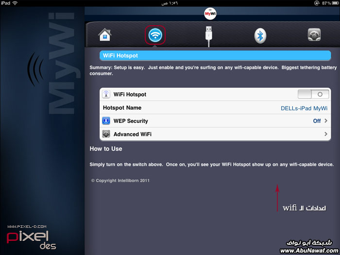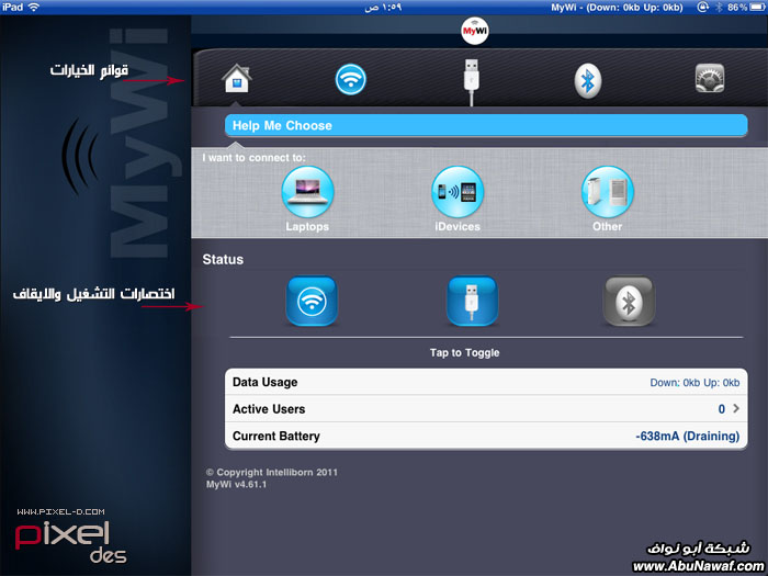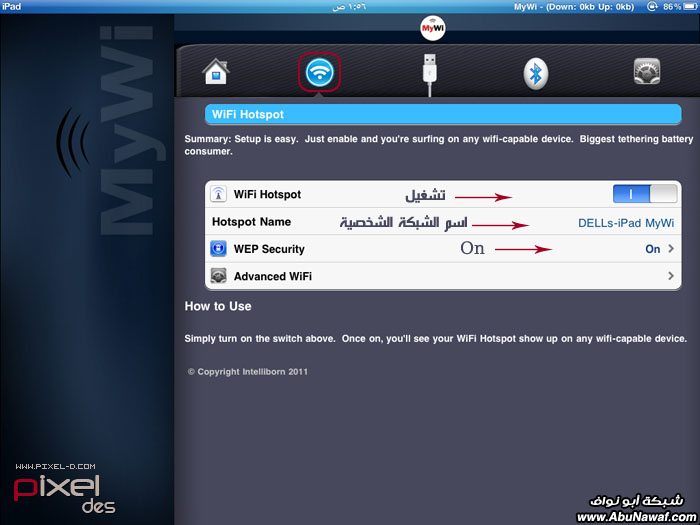 من وده يمتلك مودم خاص وشخصي فيه من وده يتنقل بالايباد مصطحباً شبكته بين يديه وكلن يقوله تكفى عطنا رمز الشبكة بنشبك النت عن طريقك فتحس بالكيان والشموخ عندما ترى المتذللين يستعطفونك من وده يتاجر بشبكته وتكون الساعة الوحده للاشتراك بـ 10 ريال <- الله يستر منتس انتي وتفكيرتس وين وصل طبعاً اكثر اللي راح يستفيدون من هالبرنامج هم أصحاب الباقات المفتوحة للاستخدامات الغير محدوده وحيث ان الايفونين مايحتاجون لهالبرنامج بسبب انه موجود هالميزه بالاعدادت الخاصة بالشبكة فيقدرون ينشئون شبكتهم بدون برنامج . . لكن الايباد مهيب متوفره هالميزه فيه .. و لكي ننشيء لنا مودم متنقل للانترنت أو بما يسمى بالوايرلس فنحتاج الى هالبرنامج المكرك MyWi الموجود بالسيديا للي مسوين جليبريك فالطريقة سهله مره - ندخل لـ السيديا - ثم ندخل على sections ونضيفي السورس هذا http://www.sinfuliphonerepo.com/- ثم ندخل على السورس نفسه ونبحث عن برنامج اسمه MyWi 4 Cracked وندخل عليه - ثم نضغط للتثبيت install ثم confirm / بعد التثبيت ,, الجهاز راح يعيد التشغيل .. فاول مانفتحه بنحصل البرنامج على سطح الايباد واجهة التطبيق . مثل ماتشوفون فوق قوائم الخيارات الرئيسية - الواي فاي - اليوس بي - البلوتوث - الاعدادت اللي يهمنا هو إنشاء شبكتنا عن طريق الـ Wifiوهنا بعد ماضغطنا على أيقونة الواي فاي ندخل على الاعدادت الخاصة فيه من عند خيار WEP Secuity نشغل شبكتنا اللي راح تاخذ اسم الايباد اثناء تفعيله بالايتونز نشغل الخيار اللي فوق ... وندخل مفتاح الشبكة الشخصية والذي يتكون من 10 أرقام نشغل الشبكه WiFi Hotspot وهنا عندنا من الخيارات لو بغيت تشغله عن طريق البلوتوث أو الـ USB وبكذا انتهينا لو رجعنا للاعدادت بنحصل اننا دخلنا على شبكتنا الخاصة وبكذا بيكون عندنا مودم متنقل للانترنت على كيف كيفك وان شاء الله يكون الشرح واضح |