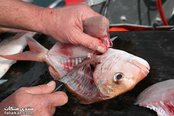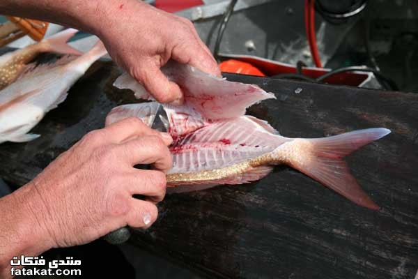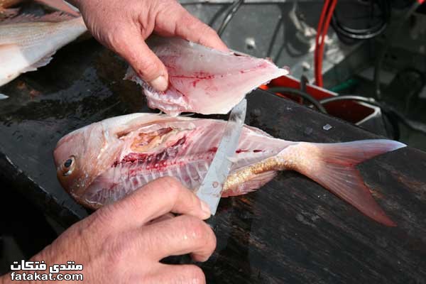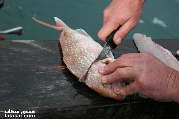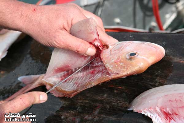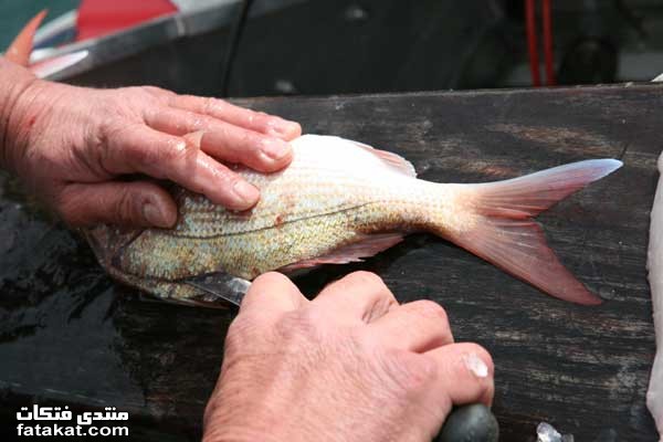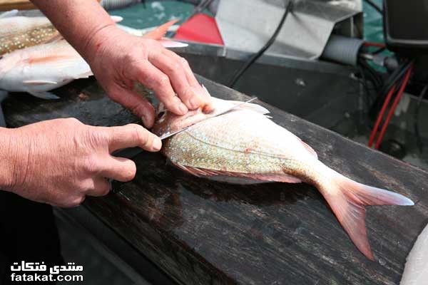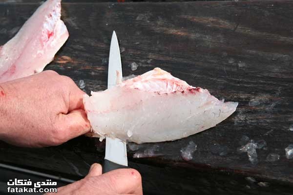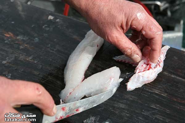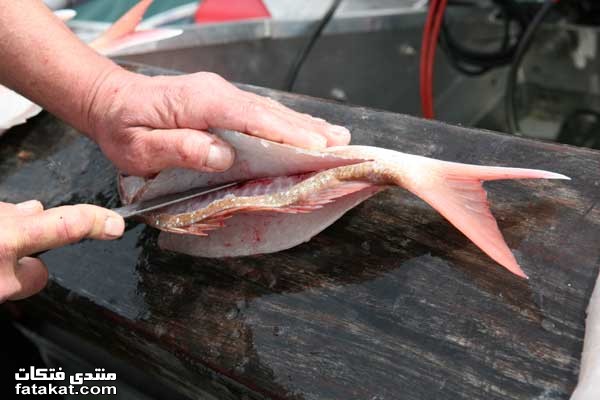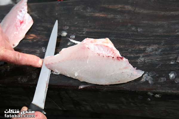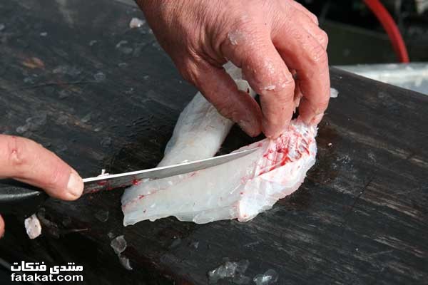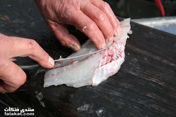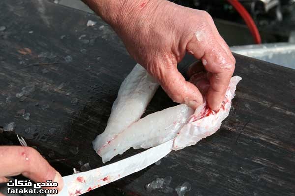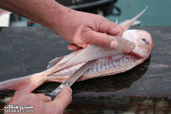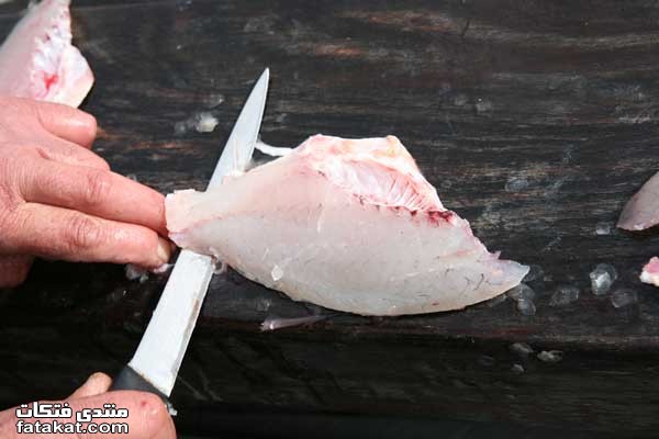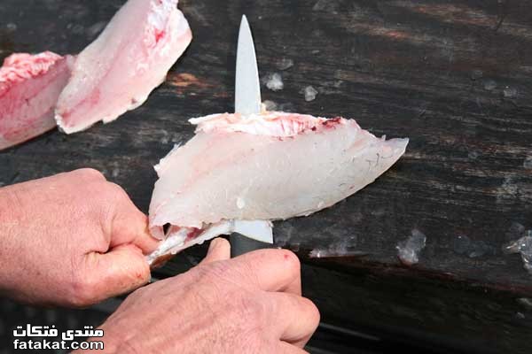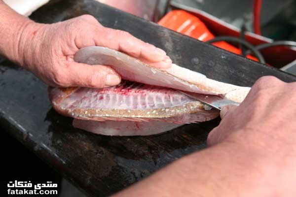 ![]() يتم استخدام سكينه حاميه جدا وبوزها مذبب و يجب ان يكون كمان السمك اللي بنخليه لازم يكون طازج علشان مايتهرى معاك وانت بتخليه اسماك كثير تنفع في الخلي المهم يكون حجمها مناسب . هانقوم بقطع السمكه من تحت الراس مباشرة وباتجاه مايل للخارج مثل الصوره السابقة دور السمكه بحيث ان تكون سلسلة الظهر ناحية بره وبعدين مشي السكينه بمحازاة السلسلة مثل الصوره السابقة وبعد كدا شد الطرف اللي يطلع بيدك وبالايد اللي فيها السكينه ابدأ افصل اللحم عن العظم بضربات سريعه ومتتاليه اقلب السمكه علي الناحيه التانيه واعمل نفس الخطوات في الجمب التاني بعد ما يبقوا الجمبين منفصلين عن العمود الفقري للسمكه زي كده ابدا ببوز السكينه تشيل اي التصاقات للسمكه بعظم الجمب لحد ما تنفصل تماما مثل الصوره التالية كرر نفس العمل علي الجنب الثاني مثل الصور التالية طريقة فصل الجلد عن اللحم يتم وضع اللحم بحيث ان يكون الجلد لاسفل ثم نحاول نمسك طرف الجلد بطرف اصابعنا وبسكينه حاميه ورفيعه في يديا الثانيه ندخلها بين الجلد واللحم هانلاقي اتفتح فراغ بسيط بين اللحم والجلد نقوم بالضغط كويس بايدنا الفاضيه علي طبقة الجلد ونثبتها علي اللوح الخشبي اللي بنخلي عليه بعد كدا بضربات متتاليه سريعه بالسكينه ونمشيها بين الجلد واللحم لحد ما نوصل لآخر قطعة السمك وبكدا ينفصل الجلد بسهوله طريقة خلي العظم : اولا هانمشي السكينه علي الخط الفاصل بين القطعتين كذا ونفصلهم عن بعض الجزء الداخلي مافيه شوك طبيعي و الجزء الخارجي فيه الشوك اللى بالجنب بطرف السكينه هانمشي علي حدود العضم ده ونزقه لبره كده لحد ماينفصل كده وبكذا صار عندنا فيليه السمك جاهز للقلي او لعمل كفتة السمك او اي حاجه تحبوها بالنسبه للراس والعضم والعمود الفقري والجناب ماترمي هذه بيتعمل بيهم احلي شربة سمك. م . ن |