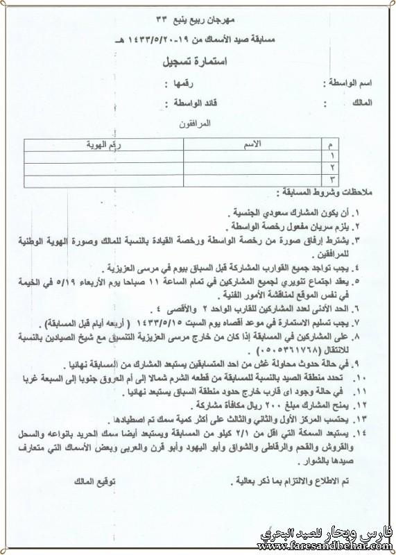 ![]() يسر منتديات فارس وبحار للصيد البحــــري .... ان تعلن لكل الصيادين والمتنزهين فى ينبع وما جاورها عن بزوغ مسابقة الصيد البحري لهذا العام والمنبثقة من مهرجان ينبع 33 والذى انطلق منذو عدة ايام وتبدأ المسابقة من 19-20/5/1433هــ واليكم نموج المسابقة . ![]() نتمنى لكل المشاركين الفوز والسلامة الدائمة ... وكل عام وانتم بخير مع تحيات شيخ الصيادين بينبع البحر و الجنة التابعة له. وفقكم الله ..,,,. |