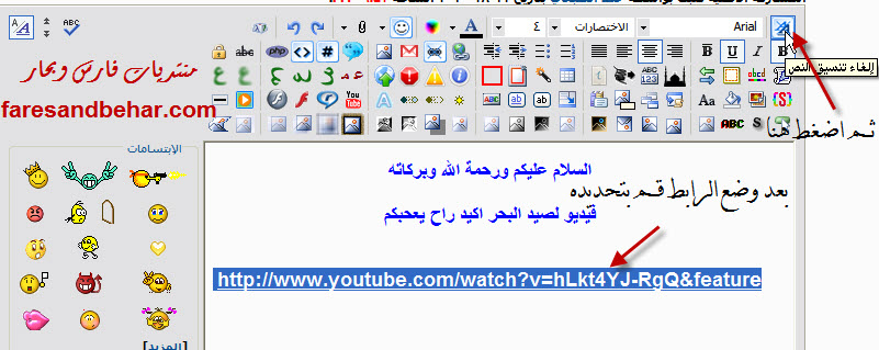 السلام عليكم ورحمة الله وبركاته شــرح كيف تنزل مقطع يوتيوب في المنتدى(بالصورة) شــرح كيف تنزل مقطع يوتيوب في المنتدى(بالصورة) هذا شرح لكيفية تنزيل مقطع من اليوتيوب الى المنتدى وطبعا الشرح من عمل زميلنا جمرة غلا وان شاء الله يكون سهل اول شي نروح موقع اليوتيوب والخطوه الثانيه نختار المقطع اذا اختارنا المقطع وعجبنا نبداء في الخطوات اولا ننسخ الرابط من التيويوب ومن ثم ننلصقه بالموضوع فى المنتدى وهذه صورة توضح اللصق ![]() ملاحظة هامة تنسيق الموضوع نتجنب تنسيق الرابط ... او بعد ماننسق موضوعونا نزيل التنسيق عن الرابط فقط ان شاء الله يكون الشرح بسيط وواضح ... الله الموفق ,. |
